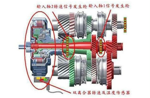 如上图(忽略图中的文字),可以看到红色和绿色两部分。实际上就可以说是两组单离合变速箱。换句话说,也就是,去掉红色部分,绿色部分可以单独成为手动变速箱;去掉绿色部分,红色部分也可以单独成为手动变速箱。由图可知,绿色部分是套在红色部分外面的,这样就可以是两根轴互不干扰了。那么,最左离合器部分,可以看到,红色和绿色是上下排列的,都可以和发动机输出端连接,但是两组离合器从来不会同时连接发动机输出端,一组连接,另一组一定是断开的。绿色离合器连接的是1、3、5档,红色离合器连接的是2、4、6档。这样,在绿色离合器接合1档时,红色离合器就做好接合2档的准备,等到绿色离合器断开与发动机的连接时,红色离合器马上连接发动机。以此类推地换档。这就是双离合所谓的“没有动力中断”。那么,湿式双离合的多片离合器是什么呢?其实就是在每组离合器上,又多加了几片离合而已。因为单独一片离合器很容易过热失效,而且缓冲度不太高。所以湿式就是在两组多片离合器组外充满液体,增加散热效果以及减少磨损。原理和单片离合完全一样。